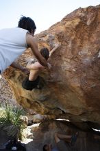 Andrew Dreher rock climbing on No One Gets Out of Here Alive (V2) in Hueco Tanks State Park and Historic Site during the Hueco Tanks Awesome Fest 2010 trip, Sunday, May 23, 2010.