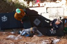 Blue Lizard Climbing and Yoga Hueco Tanks guiding on February 24, 2019, with Andrew & Lindsey; Joe; Kristina; Brad & Jana; Matt; Jason, Patty & Elise