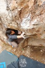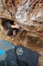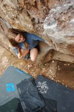 Blue Lizard Climbing and Yoga Hueco Tanks guiding on March 15, 2020, with Liam, Madison, Jack, and Stephen
