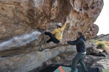 Blue Lizard Climbing and Yoga Hueco Tanks guiding on November 26, 2021, with Caroline & Joey, Devon, Hannah, Jerome, KB & Stef, and Lee