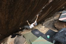Blue Lizard Climbing and Yoga Hueco Tanks guiding on November 26, 2021, with Caroline & Joey, Devon, Hannah, Jerome, KB & Stef, and Lee