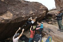 Blue Lizard Climbing and Yoga Hueco Tanks guiding on November 26, 2021, with Caroline & Joey, Devon, Hannah, Jerome, KB & Stef, and Lee
