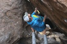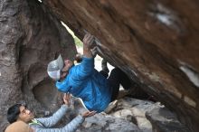 Blue Lizard Climbing and Yoga Hueco Tanks guiding on November 26, 2021, with Caroline & Joey, Devon, Hannah, Jerome, KB & Stef, and Lee