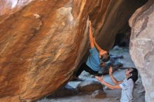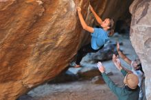 Blue Lizard Climbing and Yoga Hueco Tanks guiding on December 12, 2021, with Avery & Mia, Kevin, Jason, and JP
