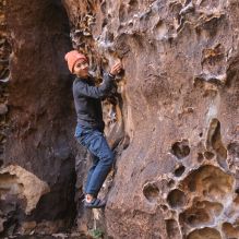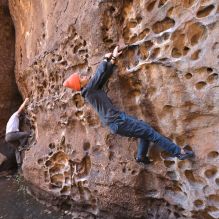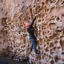 Blue Lizard Climbing and Yoga Hueco Tanks guiding on January 7, 2022, with Anna, John, Mark, and Sue
