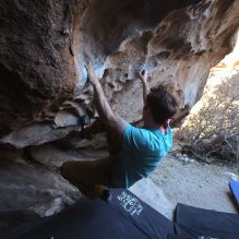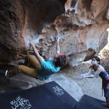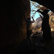 Blue Lizard Climbing and Yoga Hueco Tanks guiding on February 20, 2022, with Cam, Ian, Kamal & Jessica, Mike, and Nick