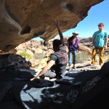 Blue Lizard Climbing and Yoga Hueco Tanks guiding on February 20, 2022, with Cam, Ian, Kamal & Jessica, Mike, and Nick