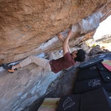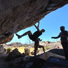 Blue Lizard Climbing and Yoga Hueco Tanks guiding on February 26, 2022, with Emily, Kevin, Mel, Tyre