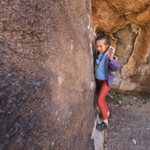 Blue Lizard Climbing and Yoga Hueco Tanks guiding on March 13, 2022, with Kevin & Sarah & Noah & Greta & Maggie, and Wendy & Trace