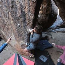 Blue Lizard Climbing and Yoga Hueco Tanks guiding on March 19, 2022, with Brock, Drew, Jacob, Ginger, Nic, and Wendy & Trace |