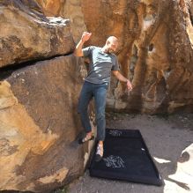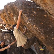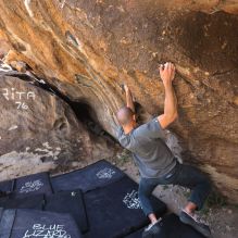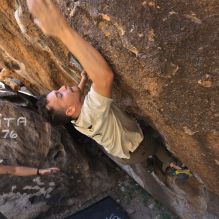 Blue Lizard Climbing and Yoga Hueco Tanks guiding on April 8, 2022, with Andrew, Cadzie, Matt, Matteo, Morgan, and Oscar