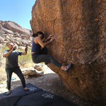 Blue Lizard Climbing and Yoga Hueco Tanks guiding on April 8, 2022, with Andrew, Cadzie, Matt, Matteo, Morgan, and Oscar