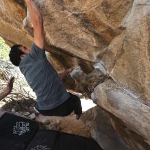 Blue Lizard Climbing and Yoga Hueco Tanks guiding on April 8, 2022, with Andrew, Cadzie, Matt, Matteo, Morgan, and Oscar