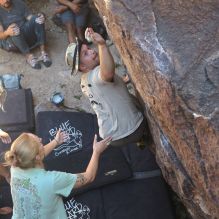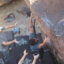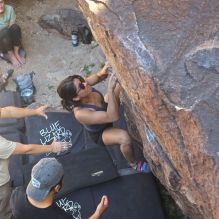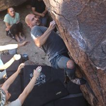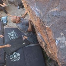 Blue Lizard Climbing and Yoga Hueco Tanks guiding on April 8, 2022, with Andrew, Cadzie, Matt, Matteo, Morgan, and Oscar