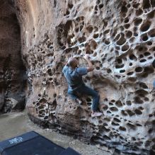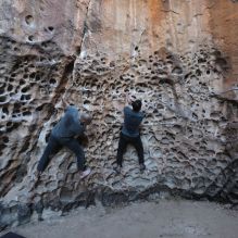 Blue Lizard Climbing and Yoga Hueco Tanks guiding on April 8, 2022, with Andrew, Cadzie, Matt, Matteo, Morgan, and Oscar