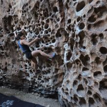 Blue Lizard Climbing and Yoga Hueco Tanks guiding on April 8, 2022, with Andrew, Cadzie, Matt, Matteo, Morgan, and Oscar