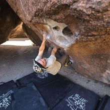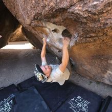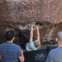 Blue Lizard Climbing and Yoga Hueco Tanks guiding on April 8, 2022, with Andrew, Cadzie, Matt, Matteo, Morgan, and Oscar