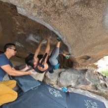 Blue Lizard Climbing and Yoga Hueco Tanks guiding on October 22, 2022, with Anna & Eric, David, Kevin, Jasmine, Justin, and Vic