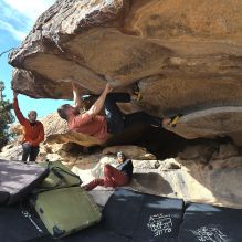 Blue Lizard Climbing and Yoga Hueco Tanks guiding on January 7, 2023, with Andrew, James, Jared, Jonah & Griffin, Sam, and Ty