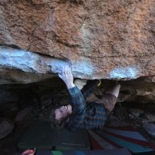 Blue Lizard Climbing and Yoga Hueco Tanks guiding on January 7, 2023, with Andrew, James, Jared, Jonah & Griffin, Sam, and Ty