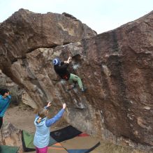 Blue Lizard Climbing and Yoga Hueco Tanks guiding on January 15, 2023, with Anthony, Fern, Ginger, Greg, Joanie, and Sophie & Kieran