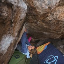 Blue Lizard Climbing and Yoga Hueco Tanks guiding on January 15, 2023, with Anthony, Fern, Ginger, Greg, Joanie, and Sophie & Kieran