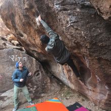 Blue Lizard Climbing and Yoga Hueco Tanks guiding on January 15, 2023, with Anthony, Fern, Ginger, Greg, Joanie, and Sophie & Kieran