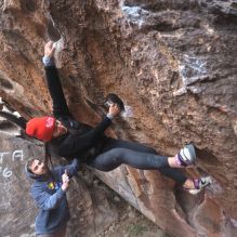 Blue Lizard Climbing and Yoga Hueco Tanks guiding on January 15, 2023, with Anthony, Fern, Ginger, Greg, Joanie, and Sophie & Kieran