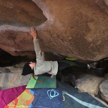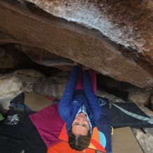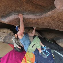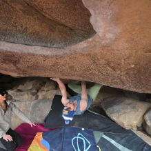 Blue Lizard Climbing and Yoga Hueco Tanks guiding on January 15, 2023, with Anthony, Fern, Ginger, Greg, Joanie, and Sophie & Kieran