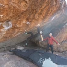 Blue Lizard Climbing and Yoga Hueco Tanks guiding on February 17, 2023, with Amelia, Crystal, Megan, and Steven