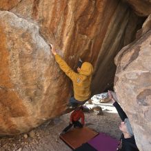 Blue Lizard Climbing and Yoga Hueco Tanks guiding on February 22, 2023, with Joe, Katia & Alfredo, Michael, Rachel, Rich, and Roy