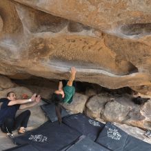 Blue Lizard Climbing and Yoga Hueco Tanks guiding on February 24, 2023, with Michael, Rachel, Rich, and Roy