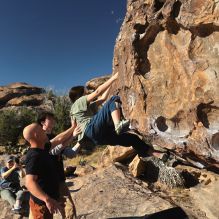Blue Lizard Climbing and Yoga Hueco Tanks guiding on March 14, 2023, with Maggie and Kevin, Riley and Dean and Travis, and Wendy and Trace