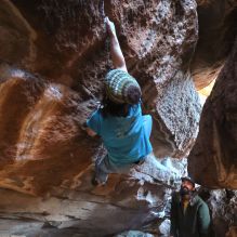 Blue Lizard Climbing and Yoga Hueco Tanks guiding on December 2, 2023, with Austin, Erik, James, and Merritt