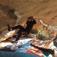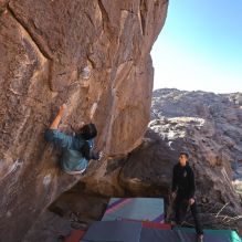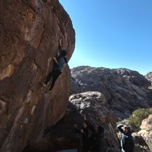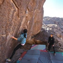 Blue Lizard Climbing and Yoga Hueco Tanks guiding on January 18, 2025, with Favia, Jordan, Spencer, Yibin, and Zach